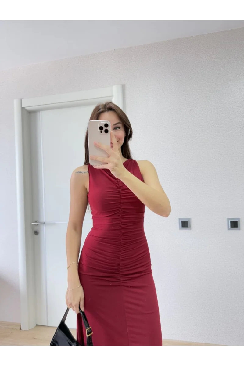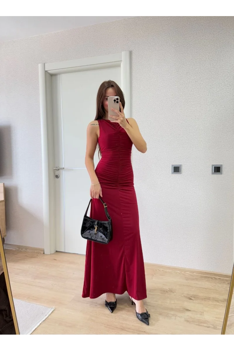 Bürümcük Kumaşlı İçi Astarlı Üzgülü Kolsuz Büzgülü Uzun Elbise - Kırmızı