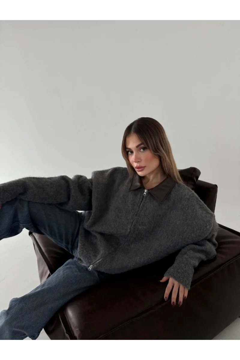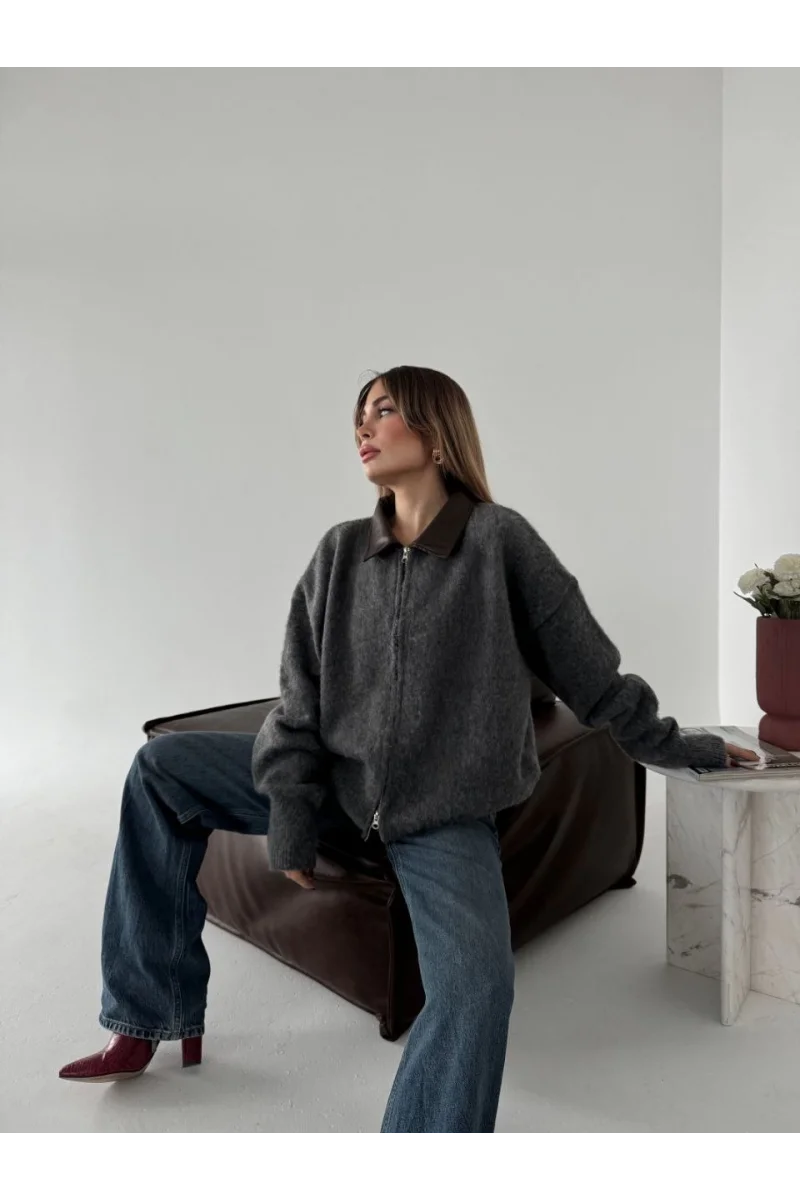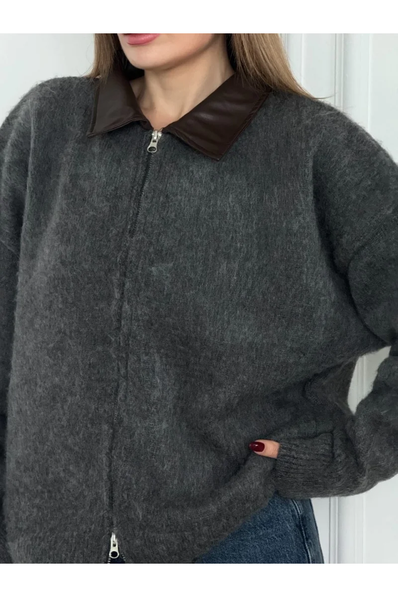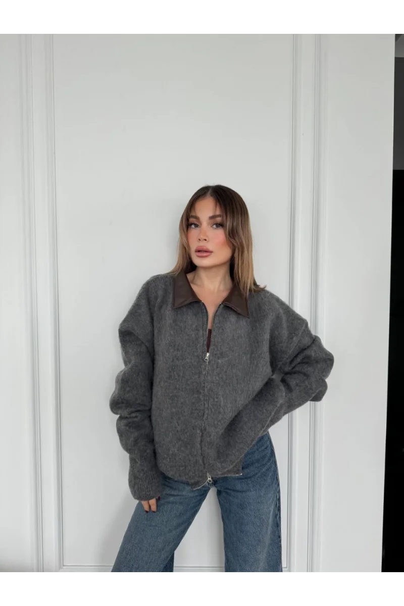 Deri Yakalı Pamuk dokulu Çift Taraflı Çalışan Fermuar Ceket - Füme