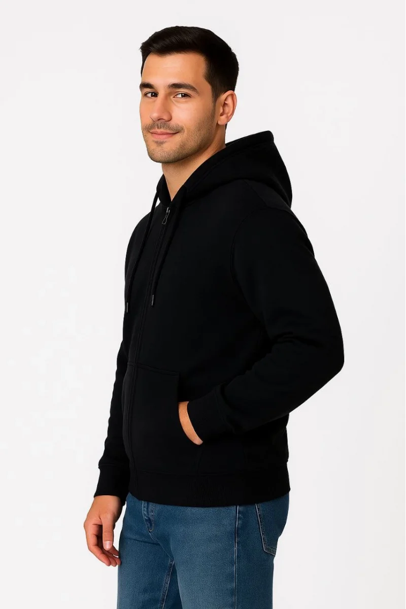 Erkek Üç İplik Kapüşonlu Tam Fermuarlı Kanguru Çepli SweatShirt Hoodie - Siyah