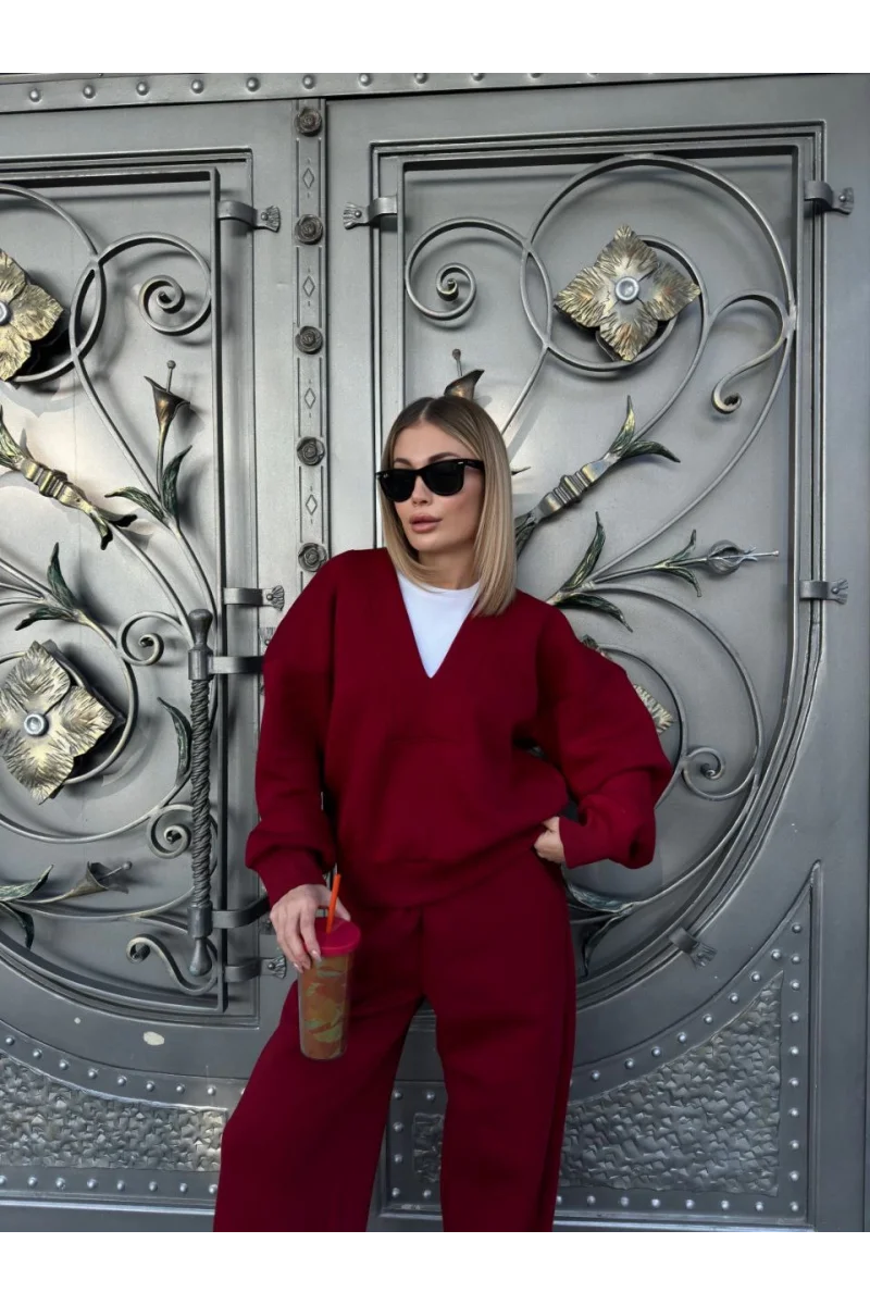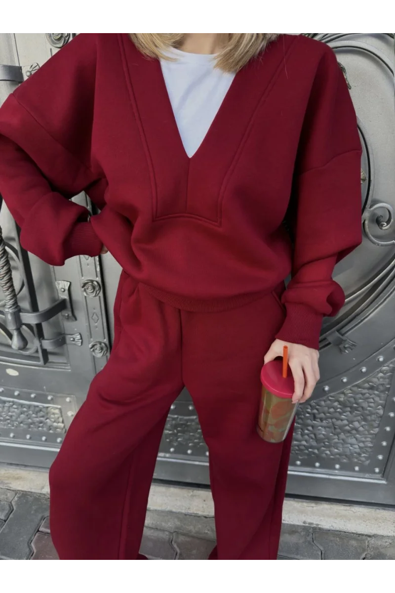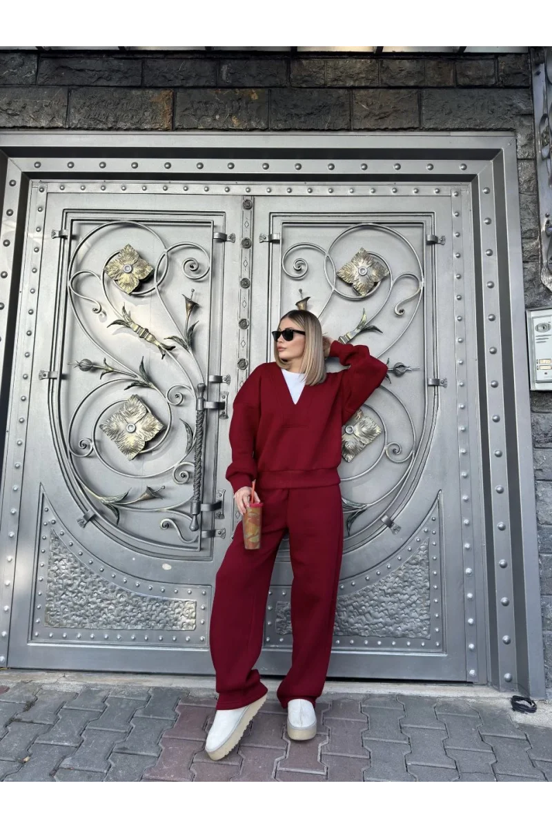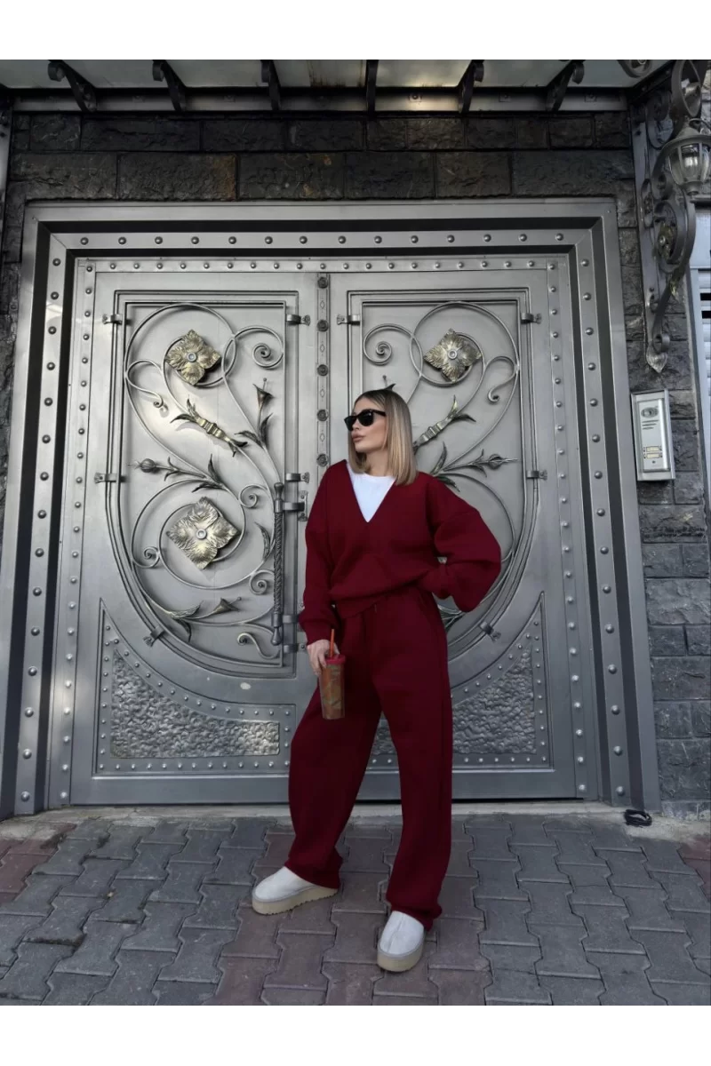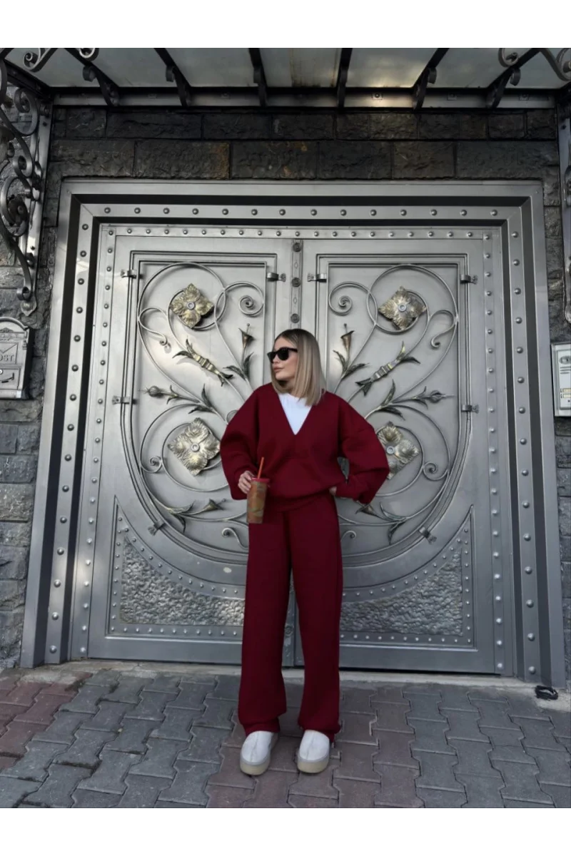 Geniş V Yaka Üç İplik Sweat Takım - Bordo