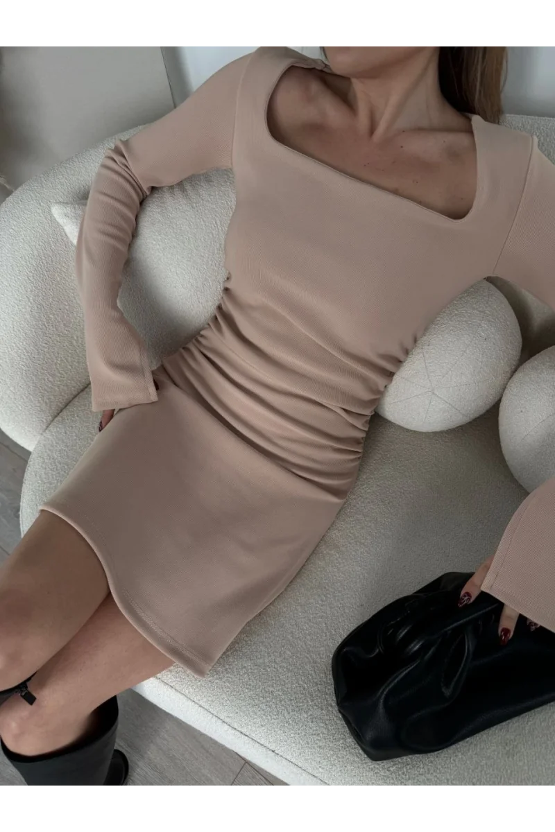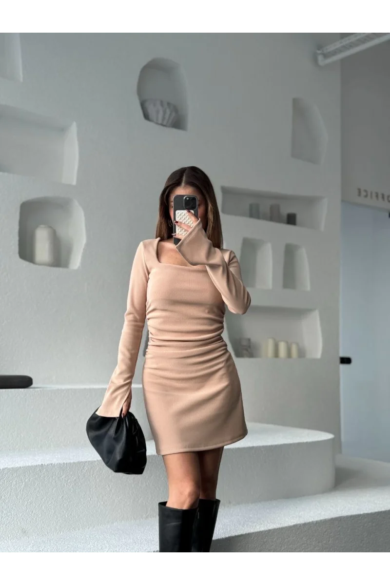 Kare Yaka Mını Boy Fitilli Elbise - Bej