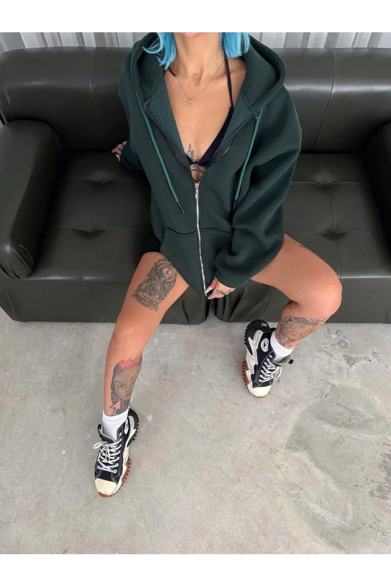 Oversize Tam Fermuarlı Uzun Kol Hırka - Haki