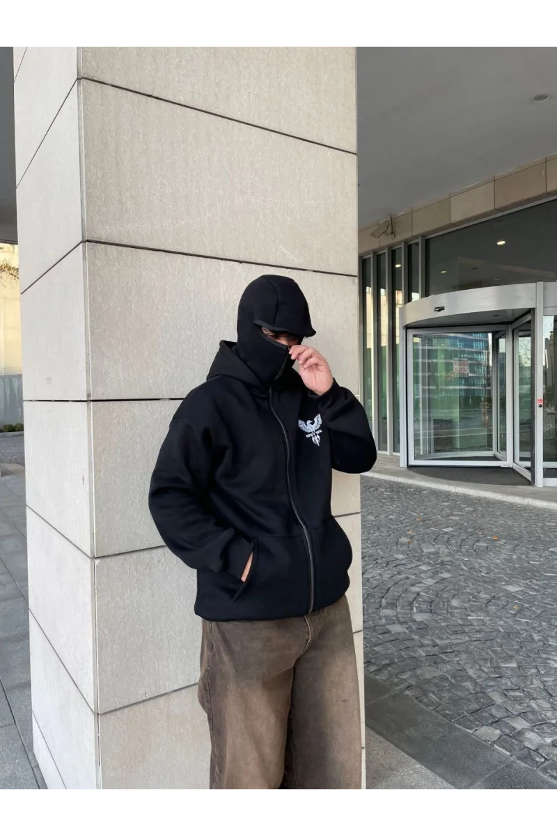 Samuray kapüşonlu ZIP Fermuarlı kapüşonlu SweatShirt - Siyah