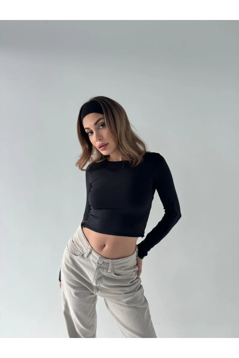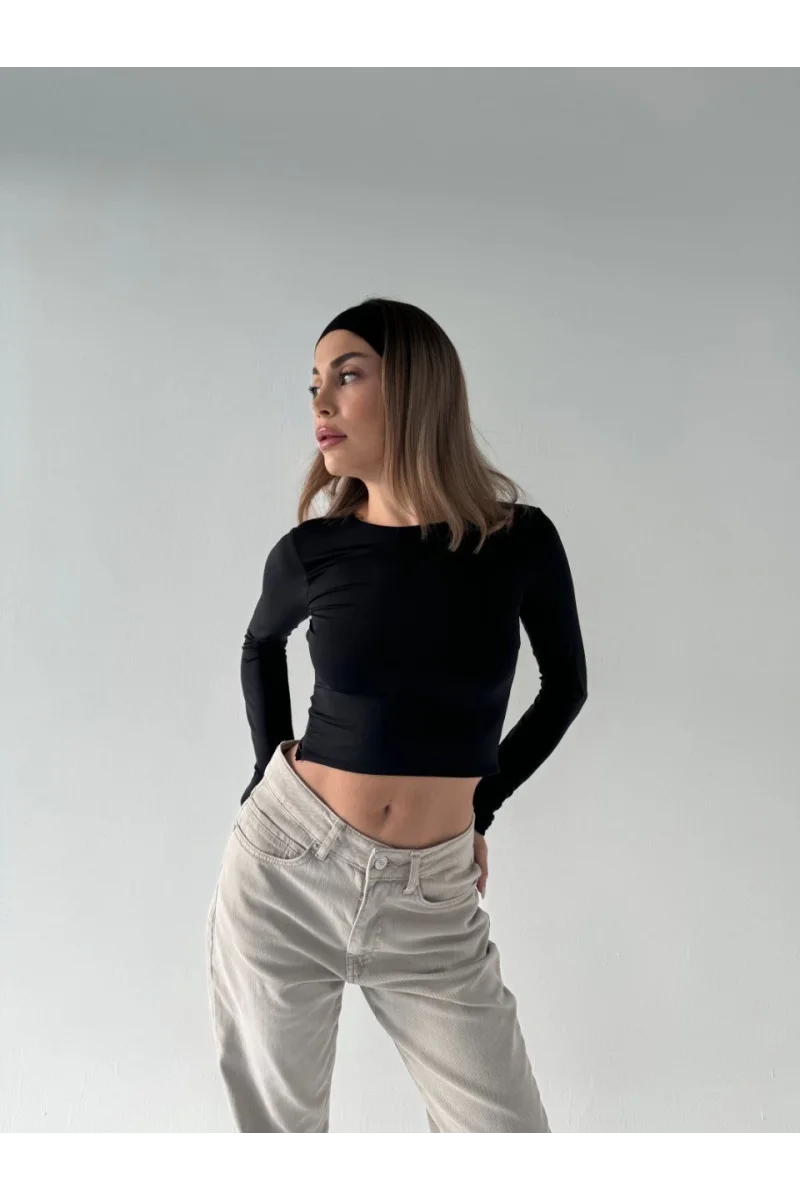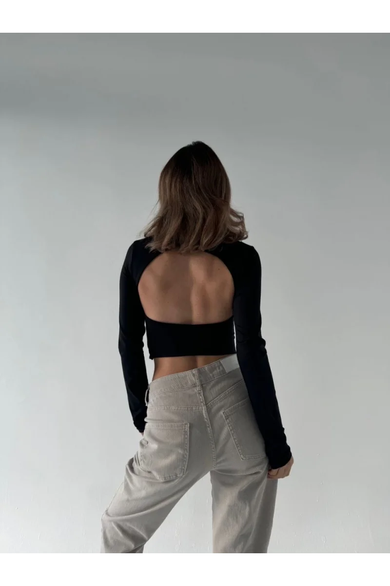 Sırt Dekoltelı Uzun Kollu Crop - Siyah