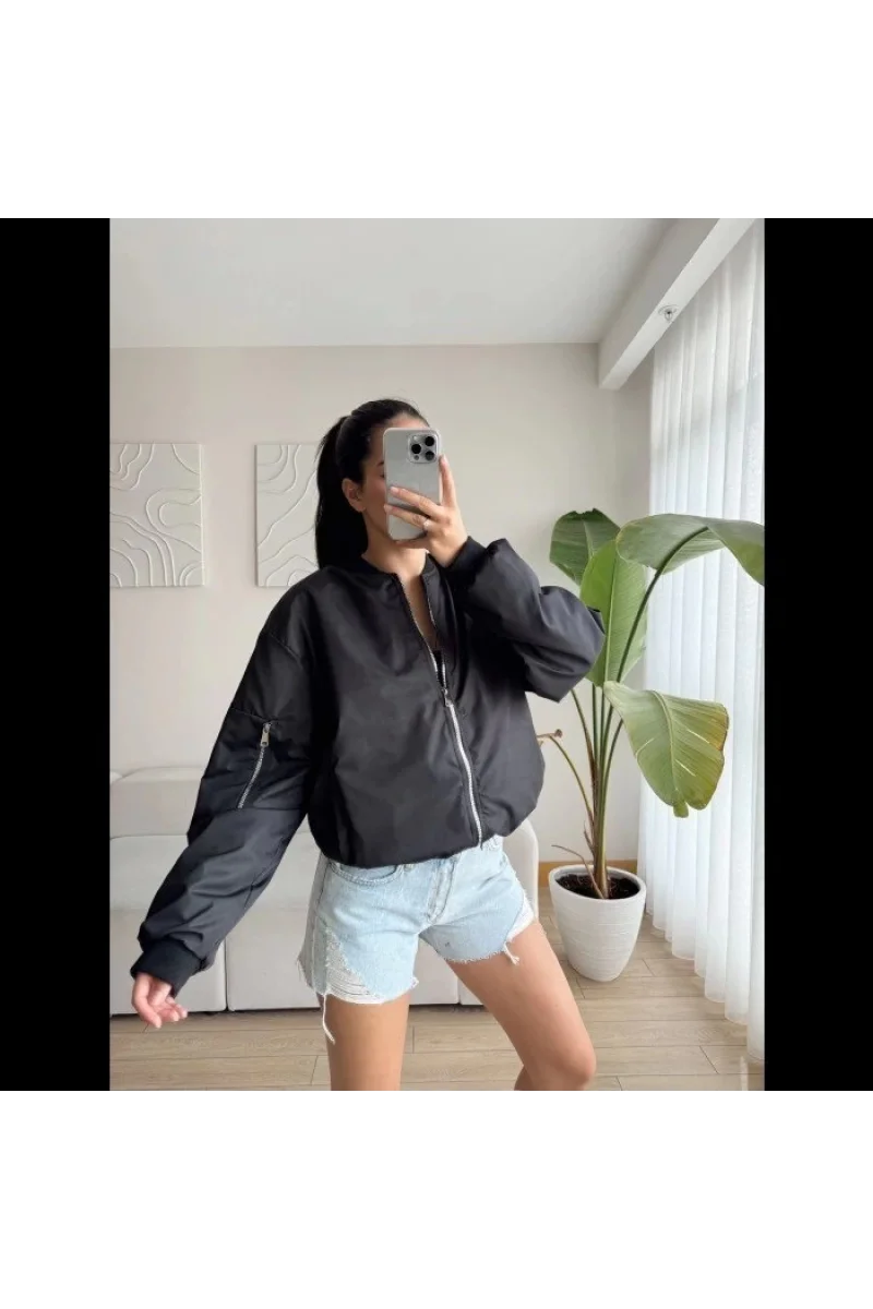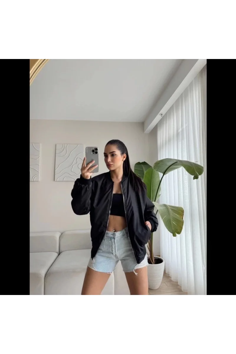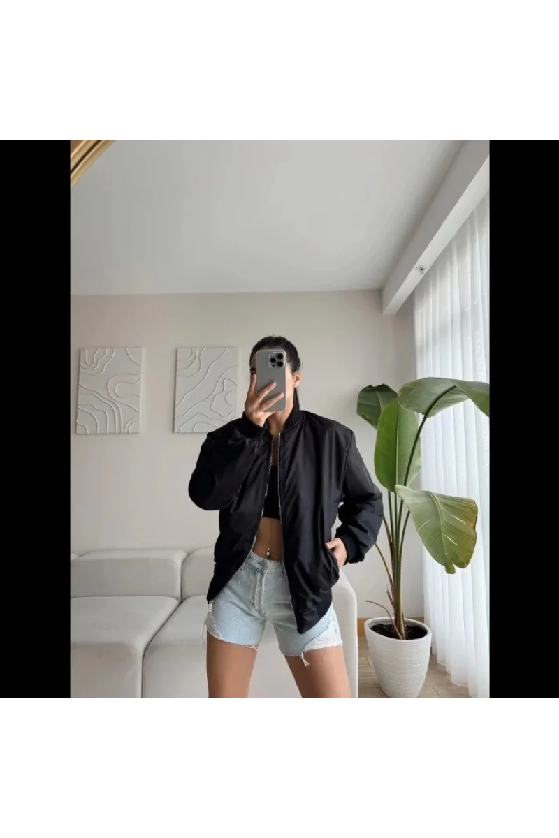 Unisex İçi Astarlı Düz Bomber Ceket - Siyah