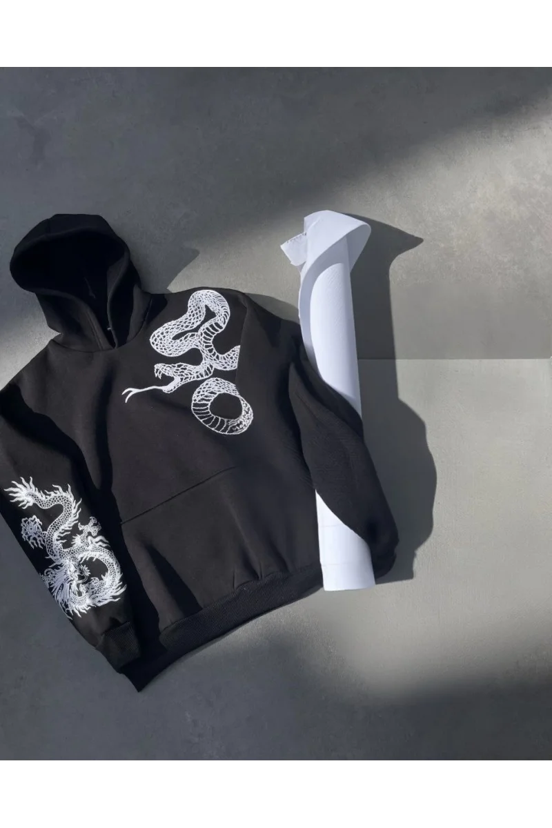 Uzun Kol Kapüşonlu Baskılı SweatShirt - Siyah